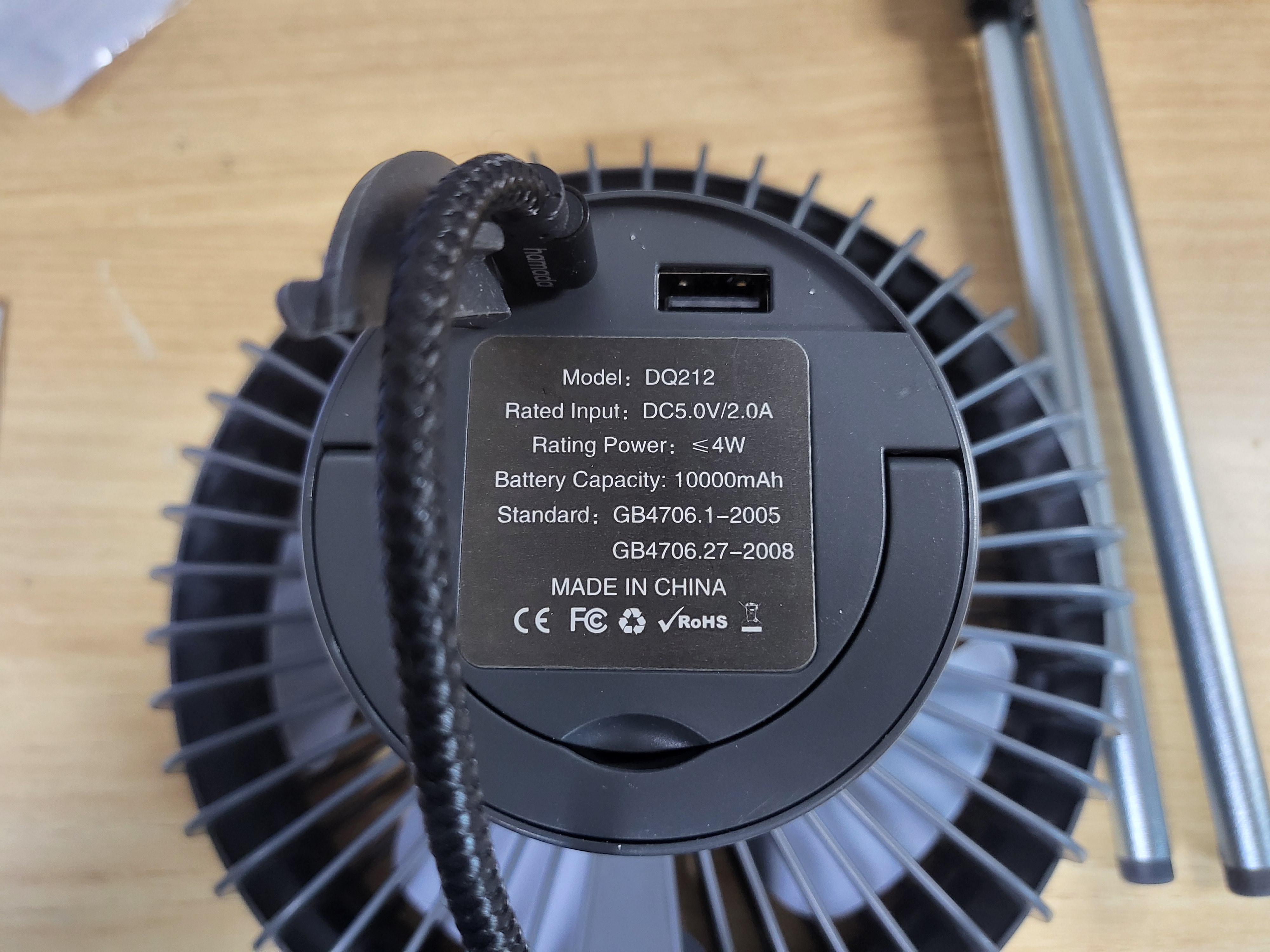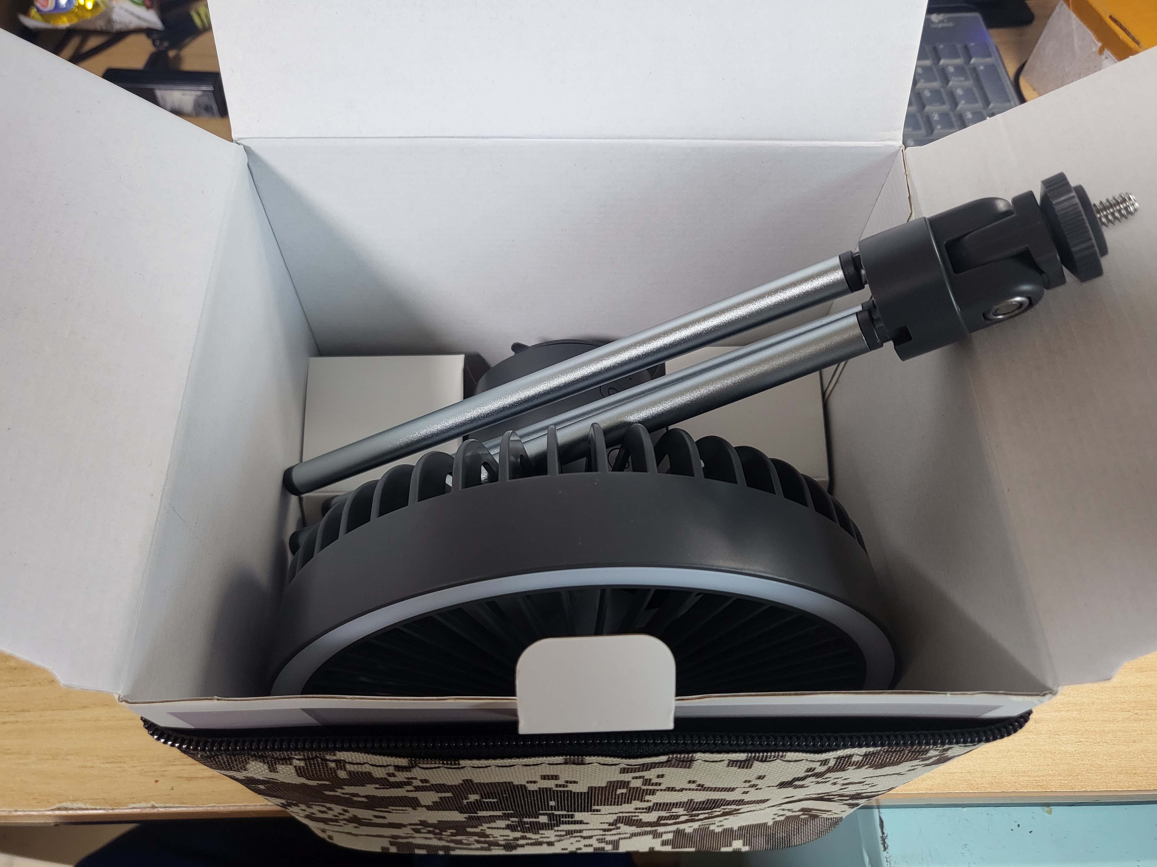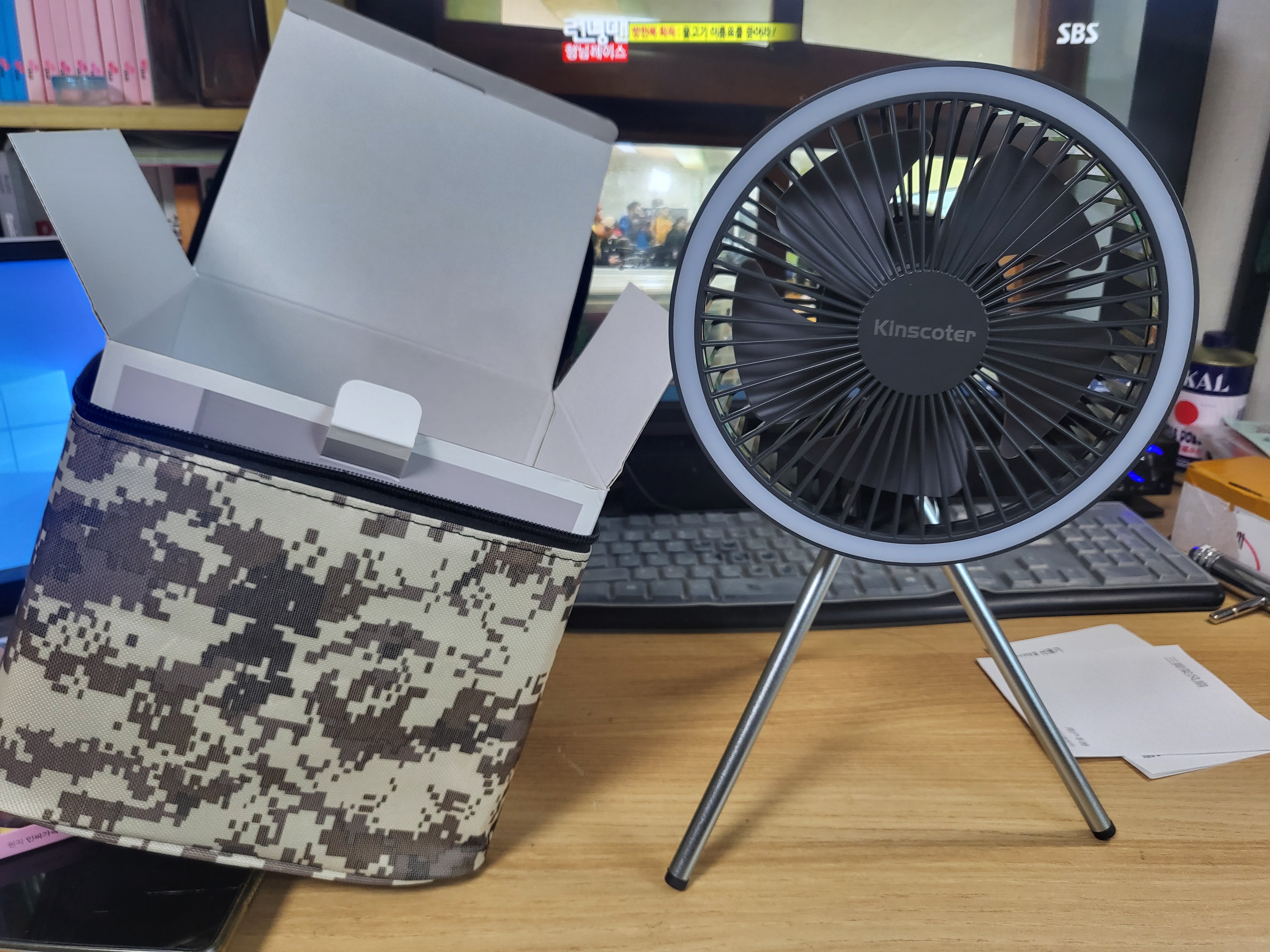구성물로는 삼각대와 선풍기가 들어 있고, 부속으로 USB-C타입 충전선과 선풍기를 매달 수 있는 고리가 하나 들어 있습니다.