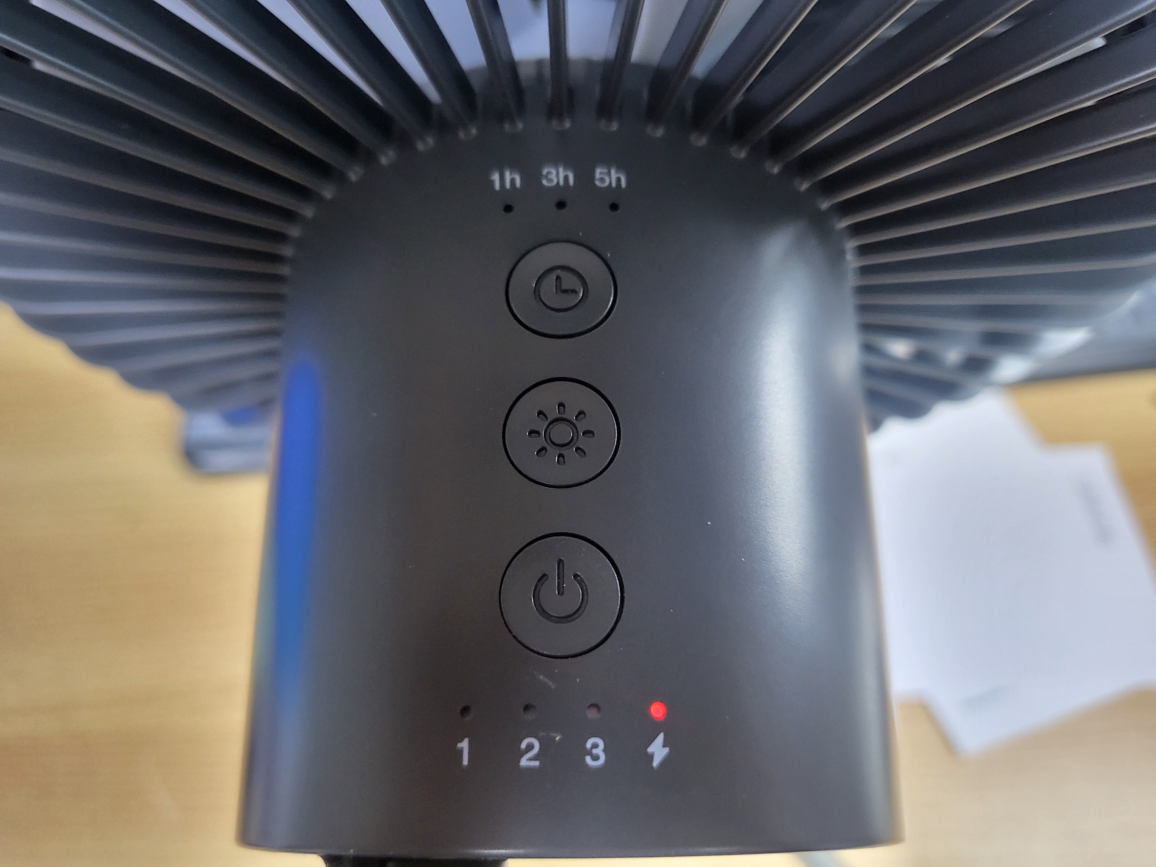 뒤에는 타이머 버튼과 LED 조명버튼, 그리고 전원버튼이 있습니다. 풍속은 3단으로 전원버튼을 순차적으로 누르면 변경됩니다.