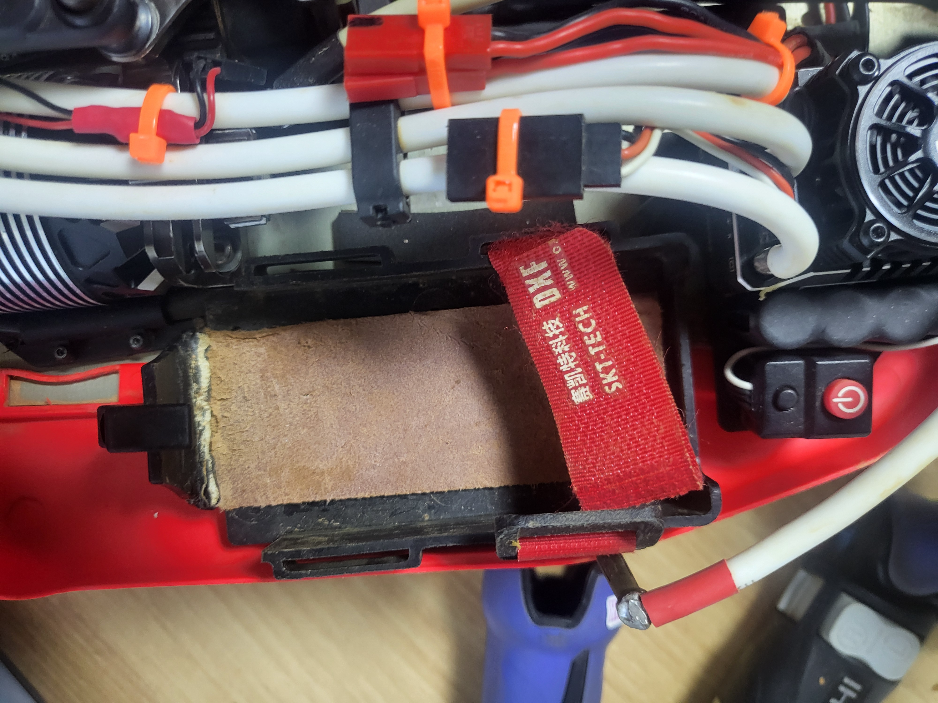 서보 고정이 다 되어 드디어 정비가 끝났구나 생각했는데 유심히 보니 배터리 트레이에 배터리를 고정하는 벨크로가 하나씩 밖에 없습니다. 저번에 서킷에서 시합 도중 최 선수가 급하게 필요하다고 해서 제 것을 사용하라고 했던 것이 기억나네요. 그래서 또 여분의 벨크로를 찾느라 온 장비가방을 2~3번씩 이 잡듯 뒤지다 없어서 결국 어뚱한 곳에서 찾았습니다.