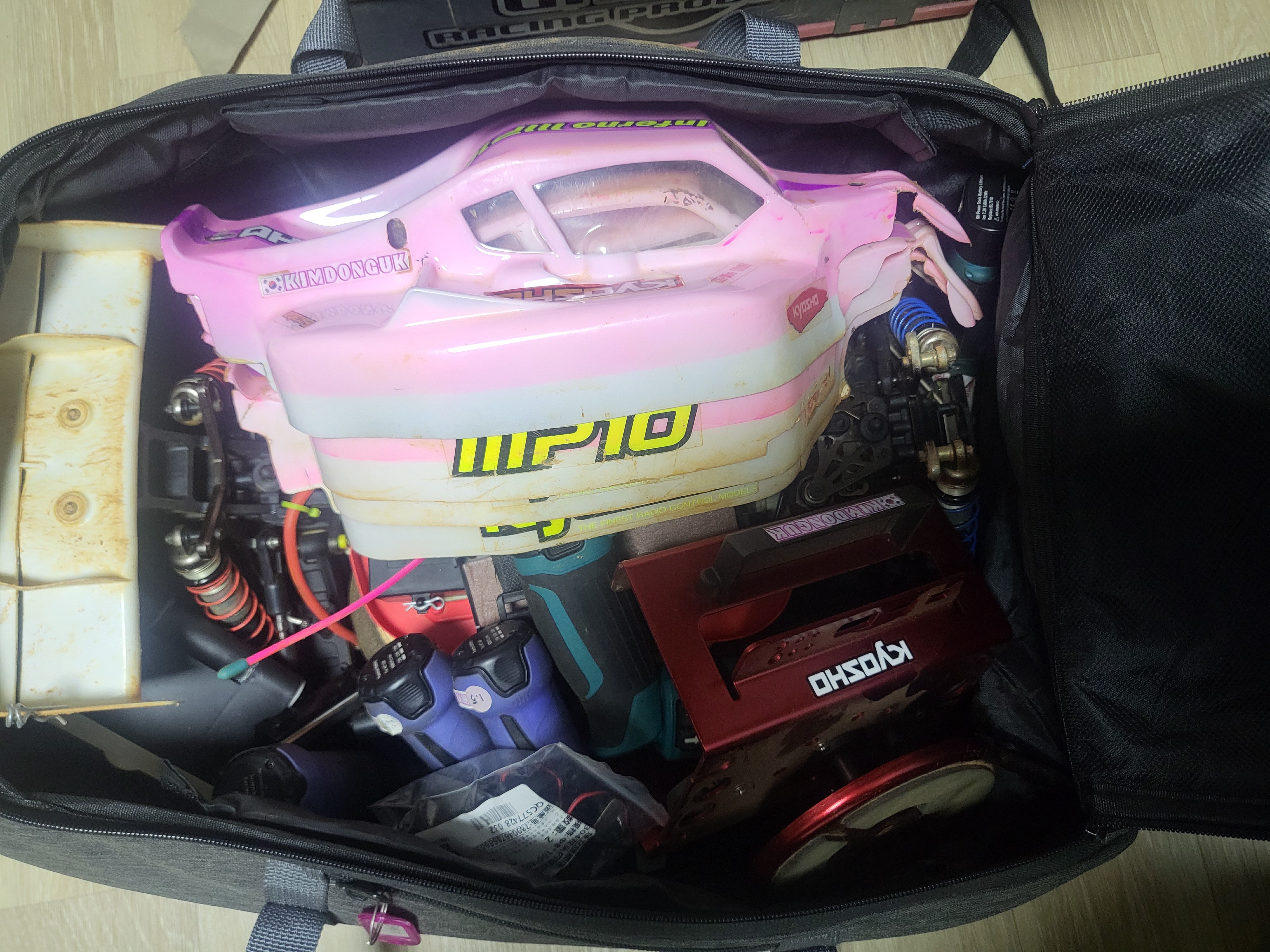 그렇게 바라보길 일주일... 오늘은 꼭 정비에 성공해야지 하는 다짐과 함께 쓸때없는 머리를 굴리기 시작합니다. 저번에 전동버기의 서보가 고장나 AS를 받은 일이 있는데 오늘은 엔진버기 대신 간단하게 작업할 수 있는 전동버기의 서보를 장착하는 것으로 만족하기로 했습니다. 그래서 마당 한쪽에 쌓여 있는 장비가방을 들고 방으로 왔습니다. 올해 5월 말쯤 마지막으로 서킷을 갔다 와 방치했으니 약 6개월 만입니다.